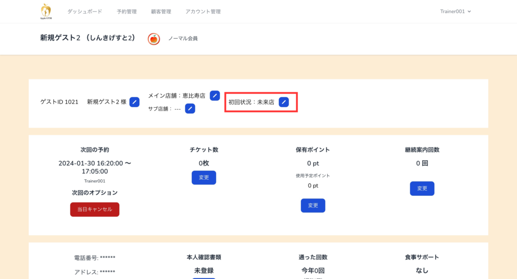 ゲスト詳細ページが表示されたら、赤枠の「初回状況」を選択してください。
