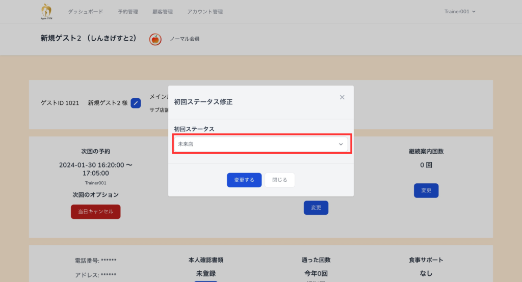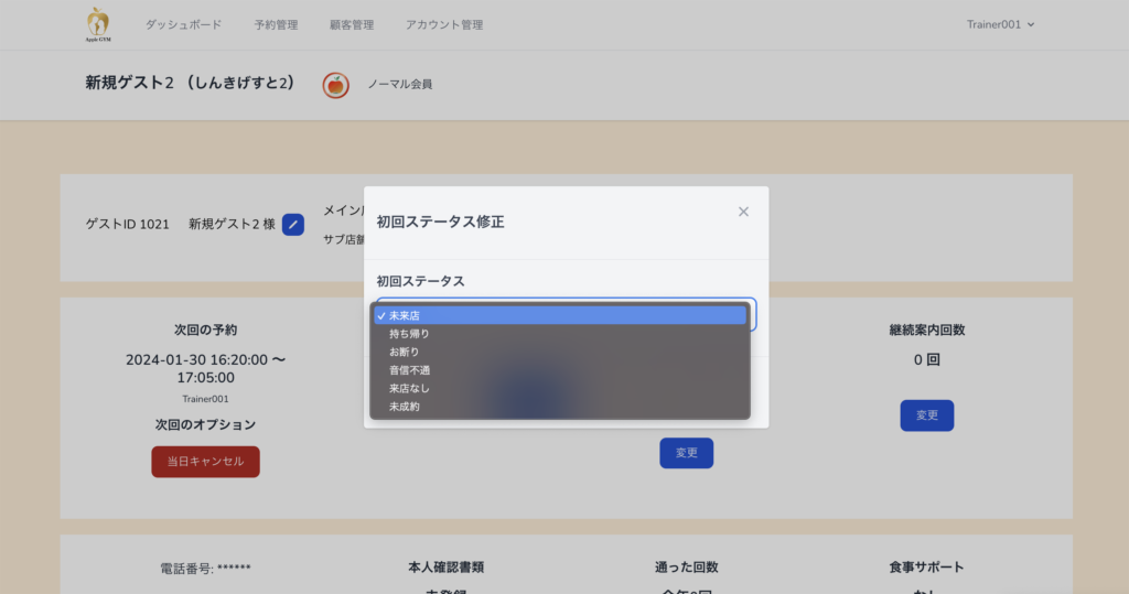 来店・未来店のゲストや成約・未成約のゲストは「来店率」「成約率」の数値に含むため、ゲストごとにステータス(結果)を設定する必要があります。